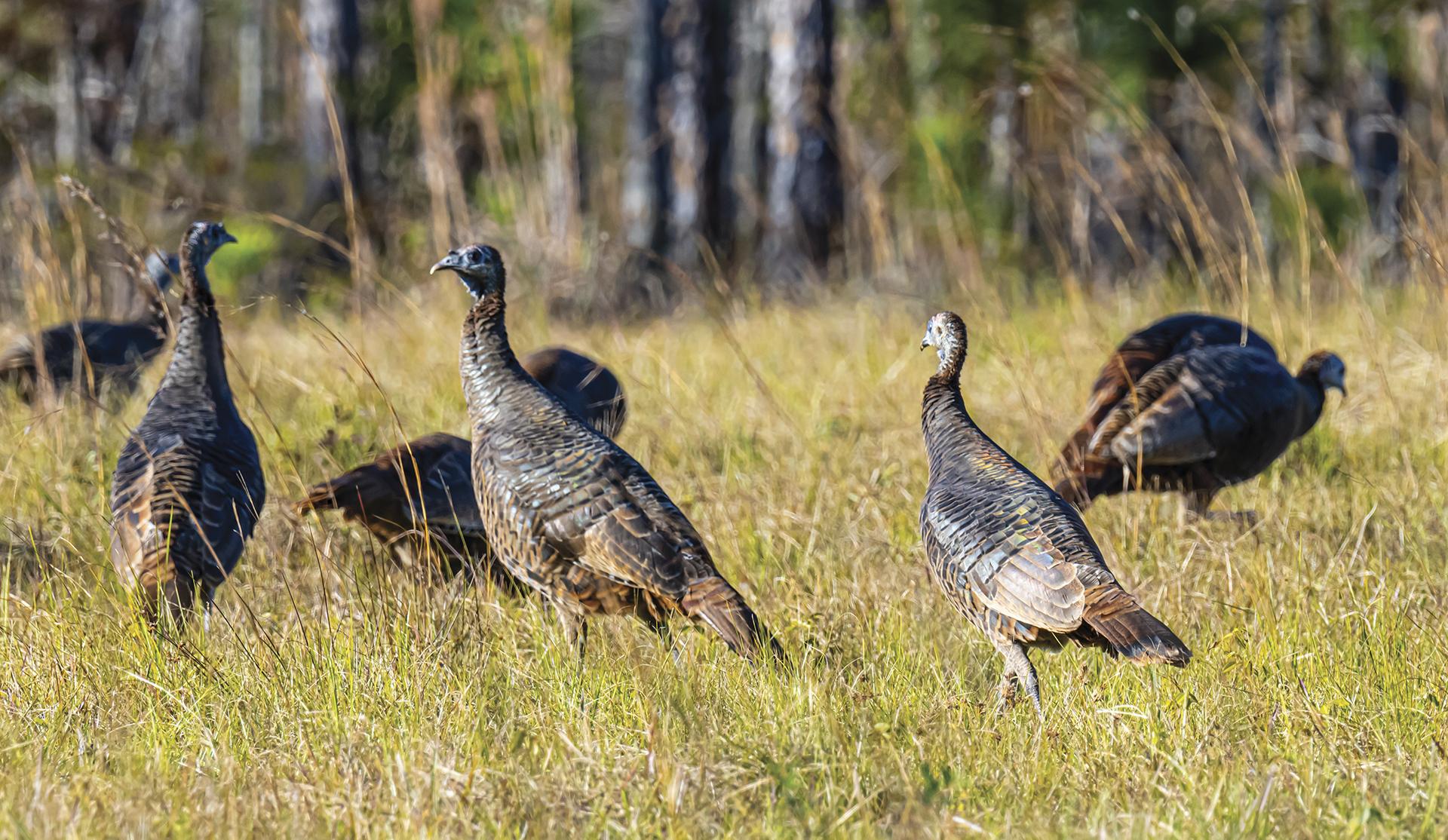 Florida is home to two subspecies: the Osceola turkey, found primarily in the peninsula, distinguished by narrower, irregular white bars on its primary wing feathers (giving the wings a darker appearance), and the Eastern turkey in the Panhandle and northern areas, where the two interbreed.